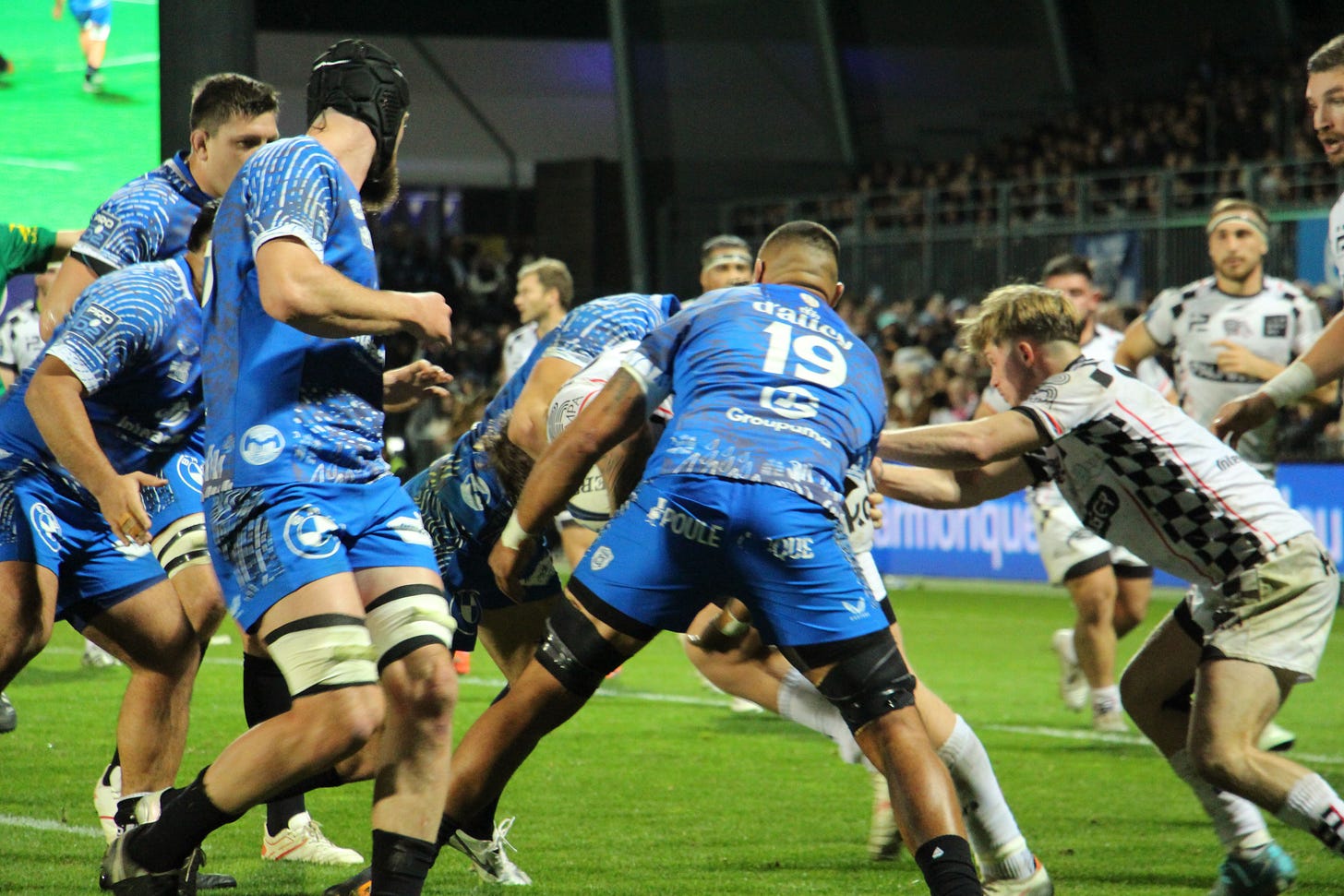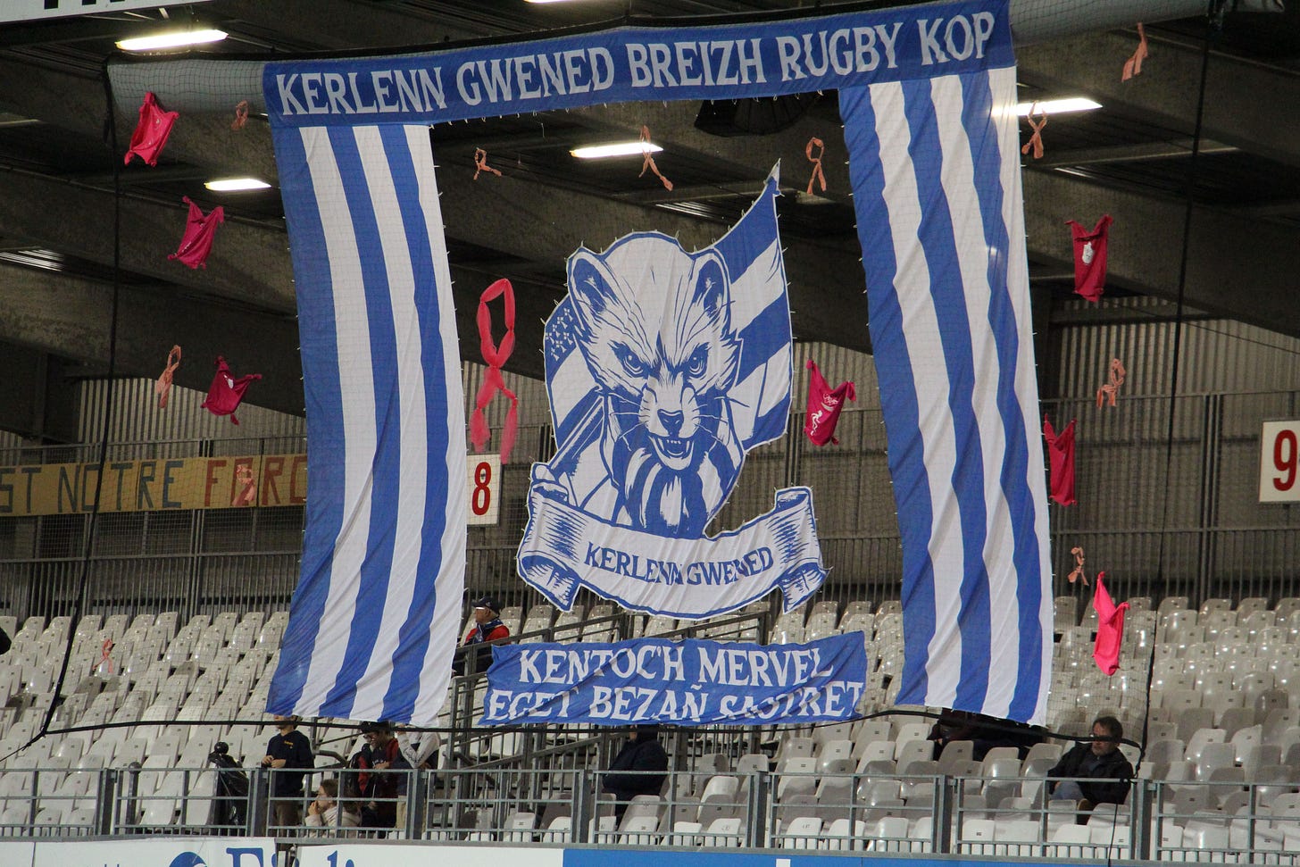 Tonight is my first experience in the stadium and it’s remarkable how rabide the fans in Rabine are. They sing and chant throughout the warm-up under the unfurled Tifo. Shout out the last name of every player, the in-stadium announcer pausing after each Christian name. A call and response that also occurs with each referee decision, break in play, or successful scrum.